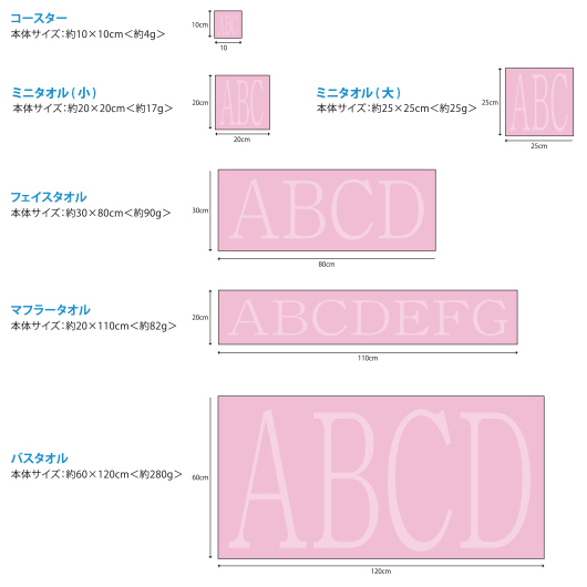 ■ハンドタオル250mm:約250mm×250mm(約25g)